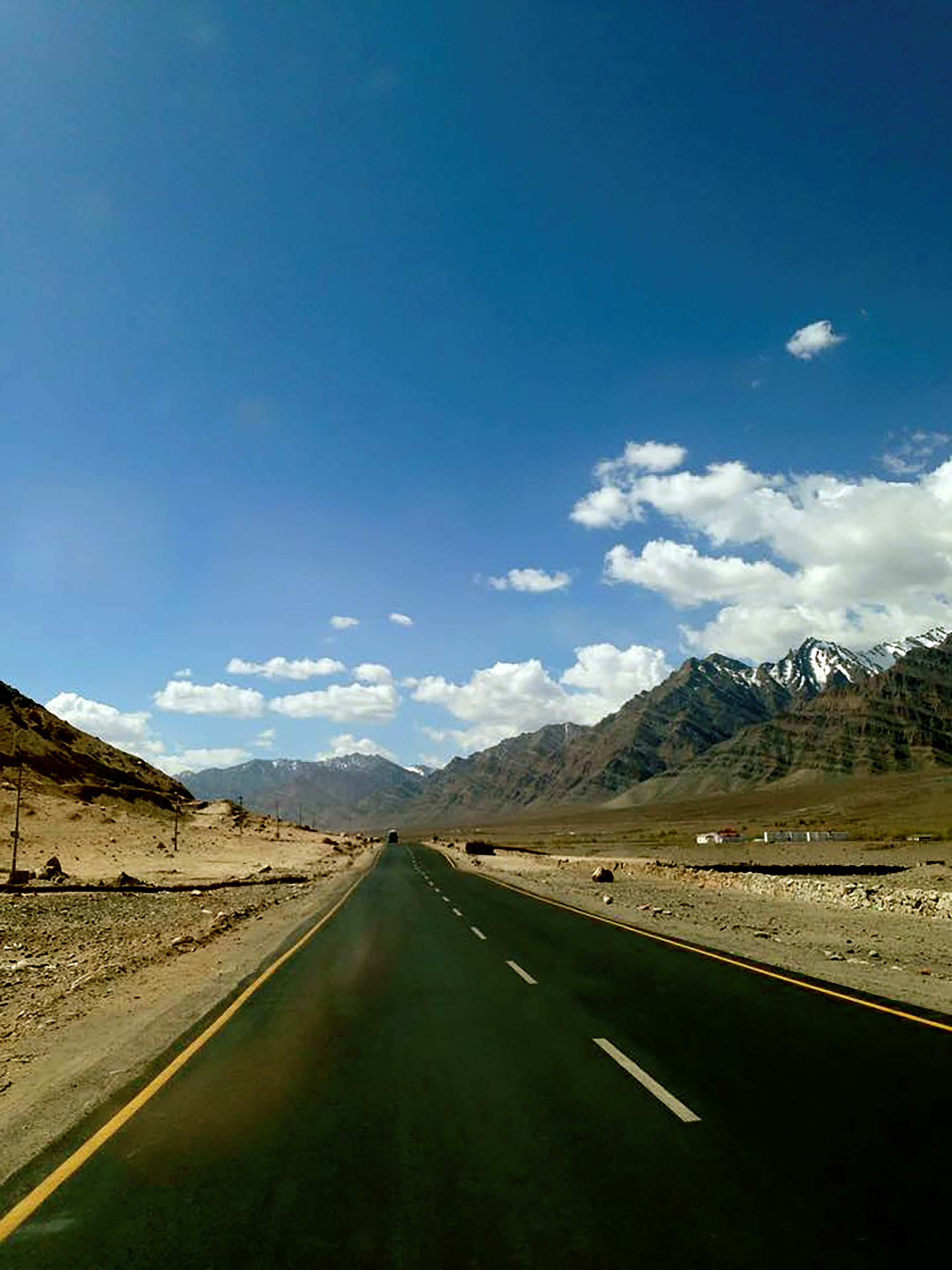 The blazing wind cuts my hopeless face, my dusty black jacket lumbers with it and my hands are tightly stuck to the handlebar of the motorcycle. With each passing mile, the glow on my face and cut of my mouth widen into something I haven’t felt before. A warm, tender and ticklish liquid flows through my heart. Spurring me alive. As I traverse past clever obstacles made by nature, the topsy-turvy roads cutting through the unending mountains, the sudden turns, the treacherous slopes, the on-coming traffic, the military convoys, nature greets my eyes with glorious sights.