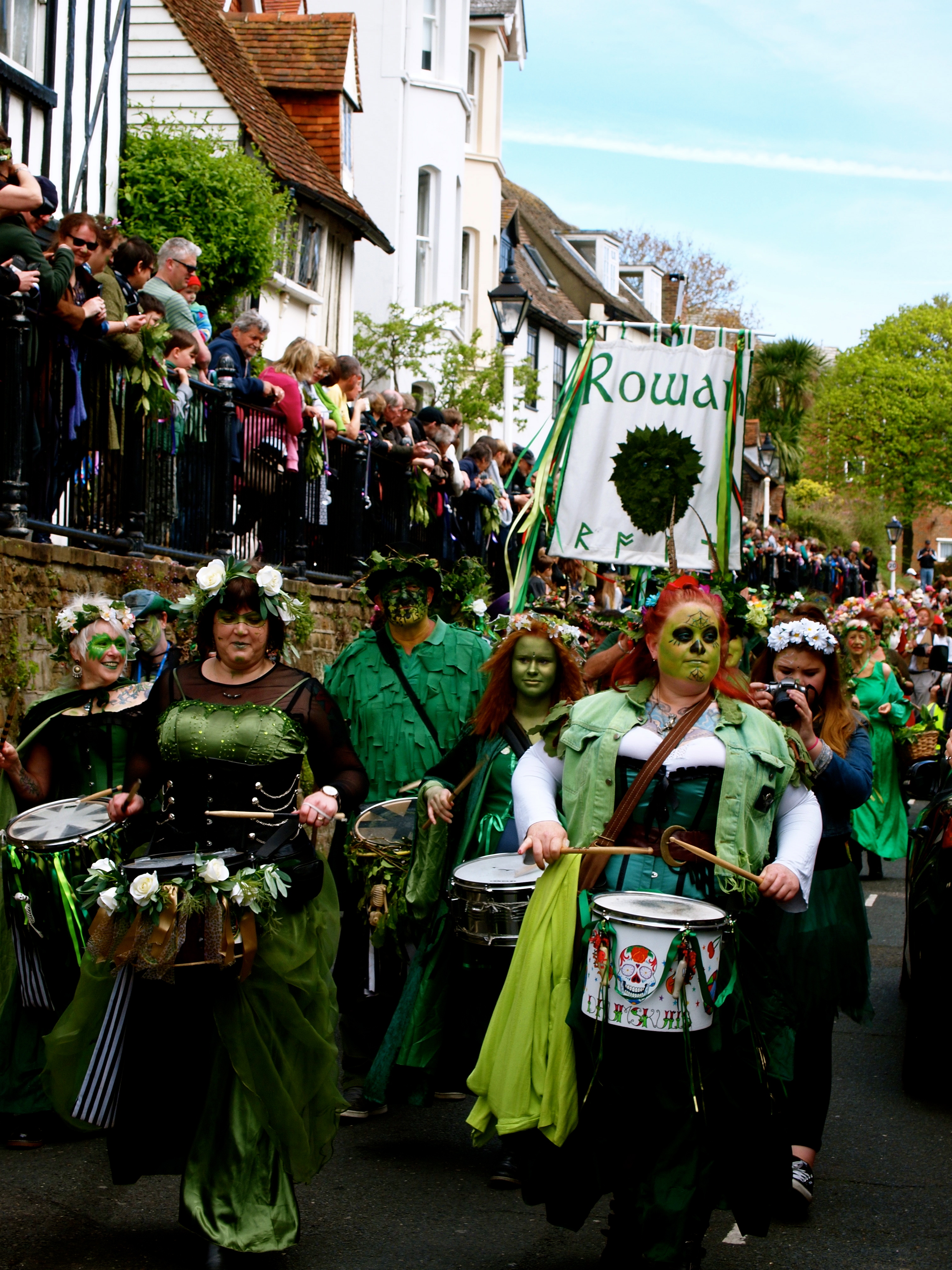 A hugely-bearded man laughs as one of the Bogies (tree sprites, apparently) daubs my nose with toxic-smelling green paint. He swiftly downs a warm pint from one of the (many) pubs lining the parade’s route, rejoins the procession and begins to dance with Kate Bush-style athleticism. A nearby policewoman tips her hat in salute.